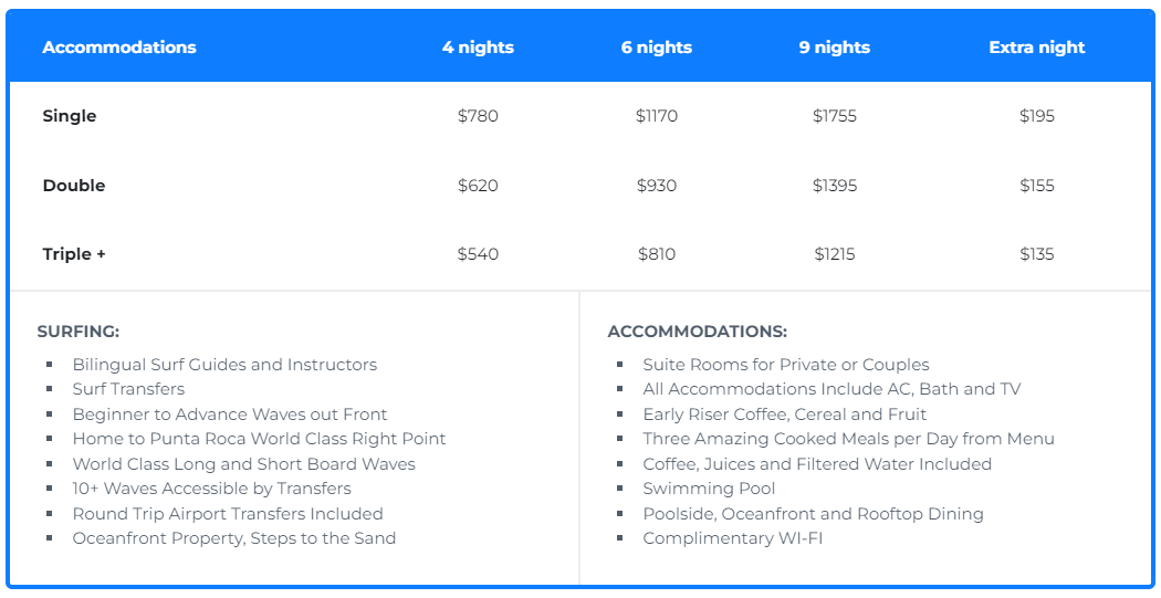 Although our hotel rooms are available at a daily rate, which you can find under “Bed and Breakfast” below, our surf tour prices are unmatched. We have carefully packaged our surf tours to include what every surfer wants in a killer foreign surf trip experience. No other local hotels offer the service, guidance, and activities at a better all-inclusive price.